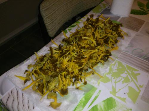 Bien le bonsoir, à défaut de truffes, je me contente de chanterelles entubes,soit 4.3kg et 200gr de pieds de moutons, ramassés le 13 janvier avant le gel et la neige.